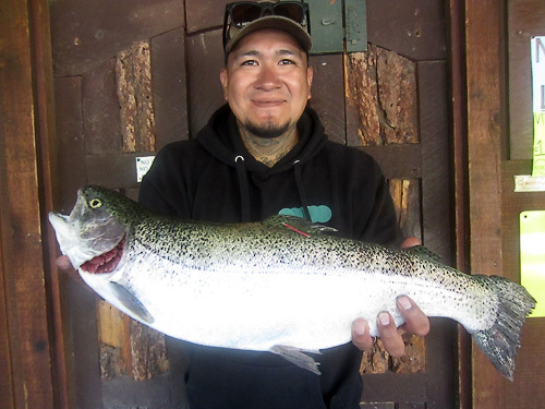 LURES:: Again it's the same as last week. The 1/6 oz Red/gold Buoyant, gold Kastmaster, silver/blue Kastmaster, black yellow dots Panther Martin on occasion, and still ANY small gold spoon. Stay on the small size for lures on Little V and 1/4oz on Big V. Fishing is still great but will require some work unless it starts to rain again, and then it's easy. Mornings and late afternoon are nice and parking is easier at Little V this past week up until Wednesday, but reports that there are no parking spaces on Big V the last 2 days.