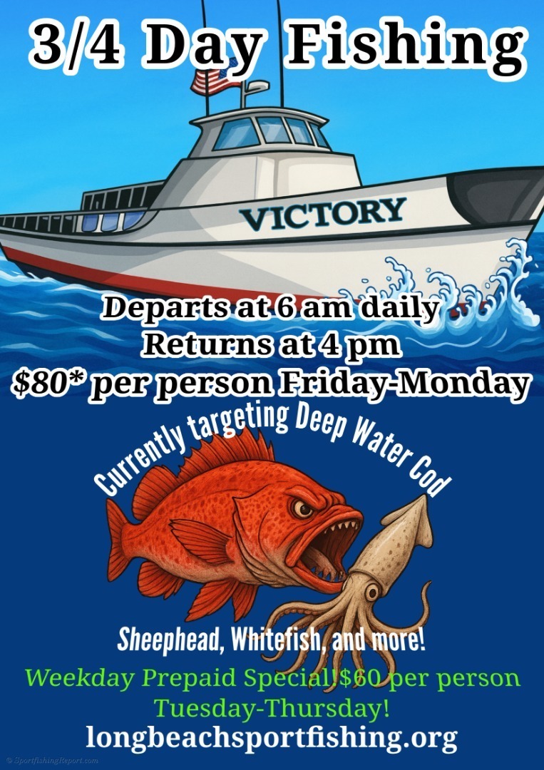 The 3/4 day boat, Victory, has been filling up the sacks with quality rockfish (300'-500'), whitefish, and sheephead. The boat departs daily at 6:00 a.m.