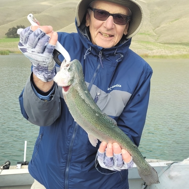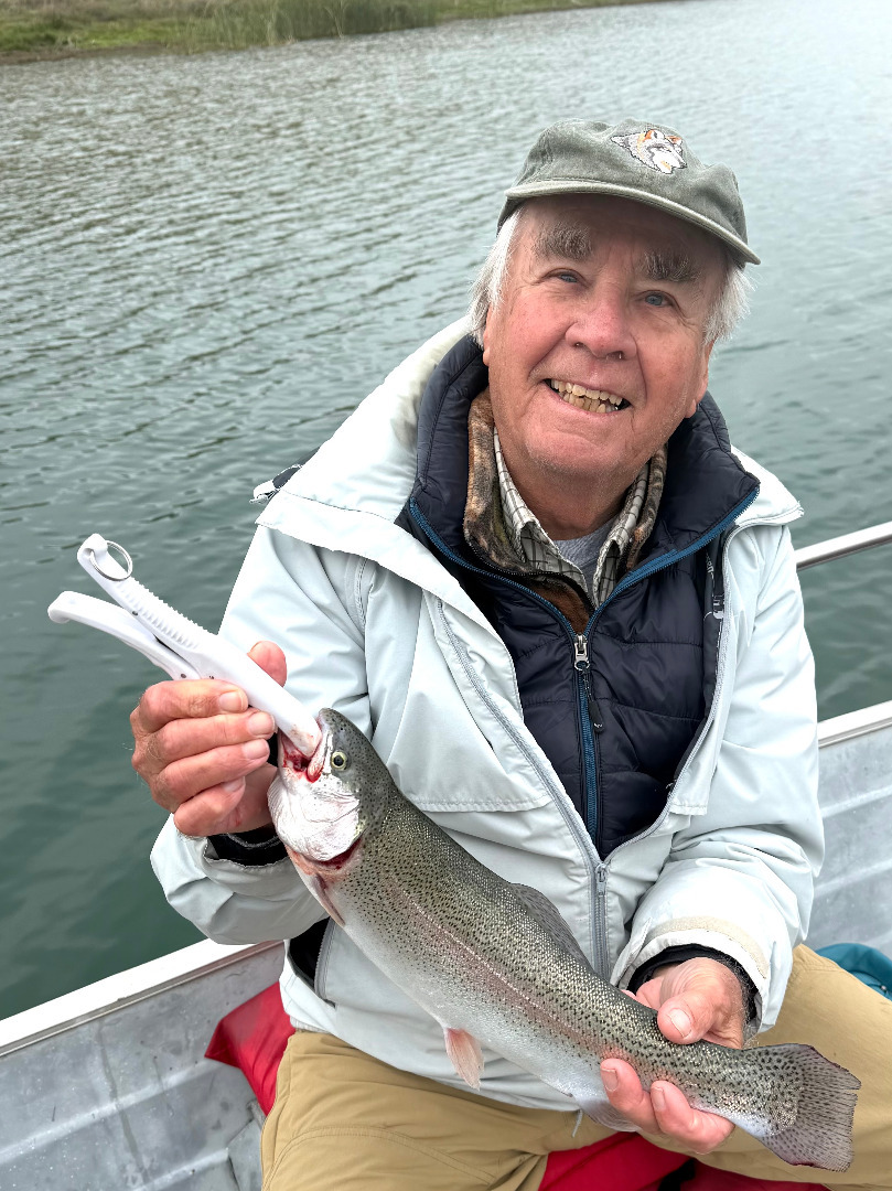 Frank Baucom, Paul Clouse, and Al Hurwitz trolled Los Vaqueros Reservoir on 11/26/25, looking mainly for Rainbow Trout. We trolled Cox, Howden, East,and Peninsula Coves. We had a number of strikes and fish on the lines, but 4-5 didn’t stay pinned, so we ultimately ended up landing two nice Mt. Lassen Trout (pictured here), each weighing about 2 pounds. We caught these Trout in both Howden and Peninsula Coves, but had no strikes elsewhere. We trolled Jointed J-9 Rapalas with some initial success, but then later had better luck with Mooselook Wobbler Spoons. We applied scent to the lures, and trolled them 10-20 feet below the surface in 18-30 foot water columns. The weather was chilly, with a surface water temperature of 62.9 degrees. The reservoir is full, and the water very clear, so trolling should continue to improve, especially with the ongoing aggressive Trout planting schedule.