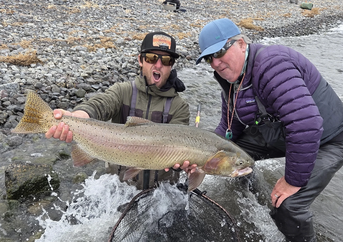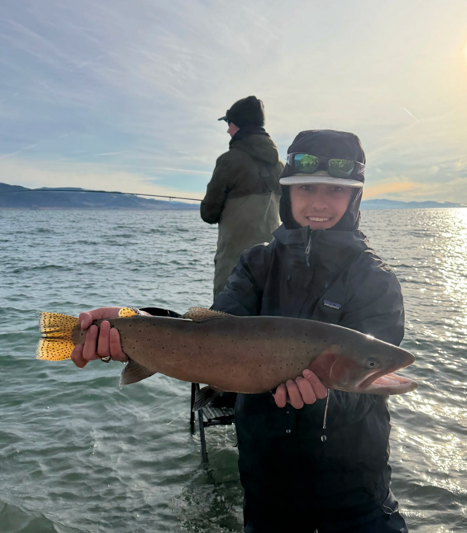 We did just that and climbed up onto the chair ladders. Ethan was familiar with two handed spey casting, and it showed laying 60+ft cast with confidence. It was a windy, wavy, cold morning once that sun cast a fiery glow across the cloud ceiling and the temp rose. Ethan's bobber slipped under “I got one and it feels big” we watched it do its paces across the ledge and after a good fired up five minutes it hit the rubber, an 8 lb summit lake strain cutty. With a grin ear to ear and one of the biggest trout Ethan had landed. We took some hero shots and sent it back to get bigger. That left James to catch one for himself and before Ethan even got situated on the ladder, I heard “I got one on” and James was swinging into that second fish and his first of the morning just like Ethan's fish! That thing paddled its way across the ledge and would not give us a chance just yet. After a great fight James got that fish's head up and slid him right into the bag. Got dad's picture and watched that fish slip back into the depths. And for us all, it was a perfect morning.