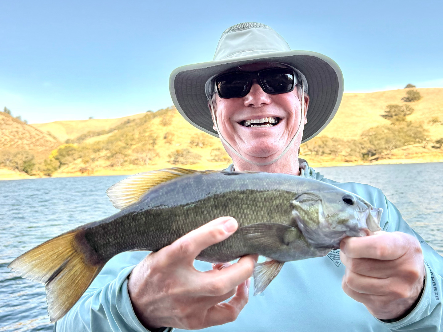 Paul Clouse and Al Hurwitz trolled all sections of Lake Del Valle on 10/30/25, trying to catch a variety of Bass. It was a slow day, but we managed to catch 4 Smallmouth Bass on 1/4 oz. inline feathered spinners. All the lures had scent applied and were trolled about 20 feet below the water’s surface. Two of the Bass weighed about 1/4 pound, while two larger ones (pictured here) weighed 1.25-1.5 pounds. Three of the fish were caught along the eastern rock wall entering Heron Bay, while one was caught along the western shoreline. There were a couple of other potential strikes as well. The fish fought well, occasionally making spirited jumps.
