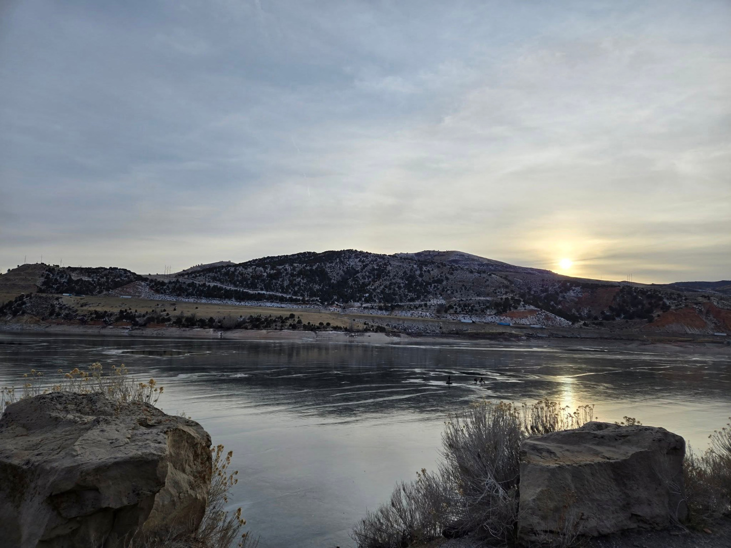 Echo Reservoir remains partially frozen, with a mix of ice and open water