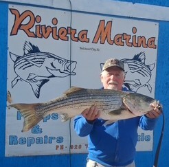 Here’s a great photo of Steve Beasley with a trophy-sized striper he landed at Community Park. Steve was fishing from shore, throwing a swimbait, when he made this incredible catch.